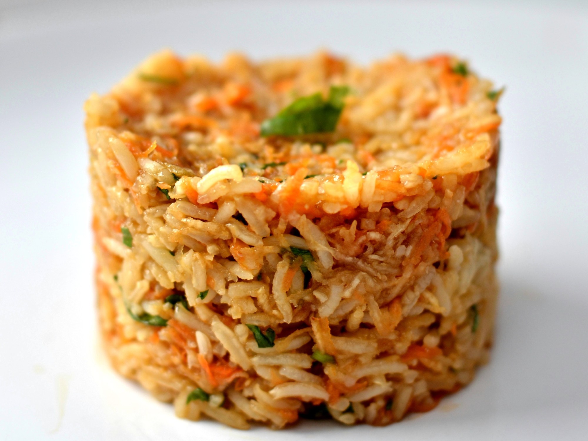 3. Fertigen Reis zu geriebenem Gemüse hinzufügen und mit Sojasauce durchmischen bzw. abschmecken (je nach Sojasaucenart etwas mehr).