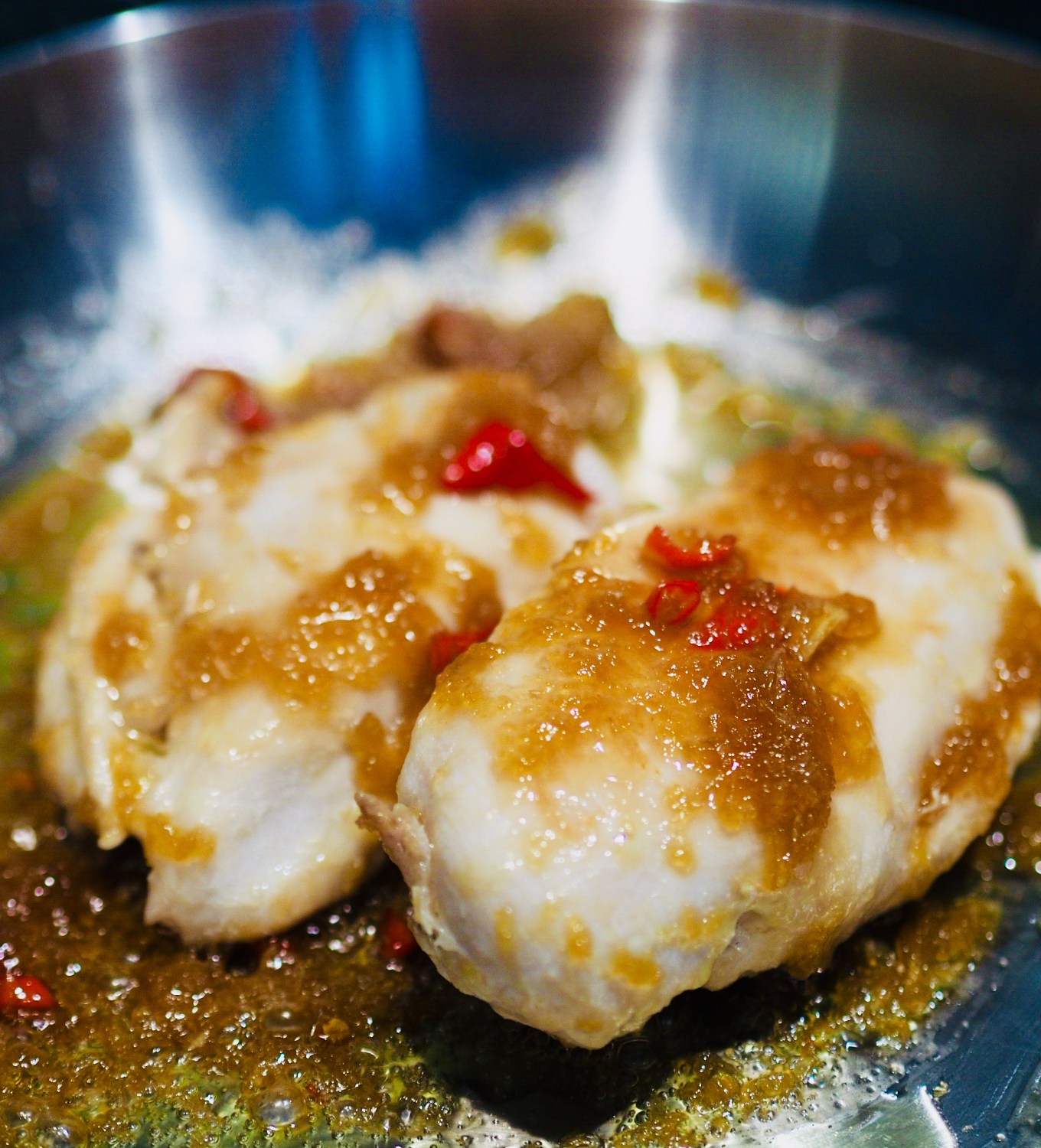 4. Die Hühnerbrust hinzufügen und gemeinsam mit der Sauce fertigbraten.