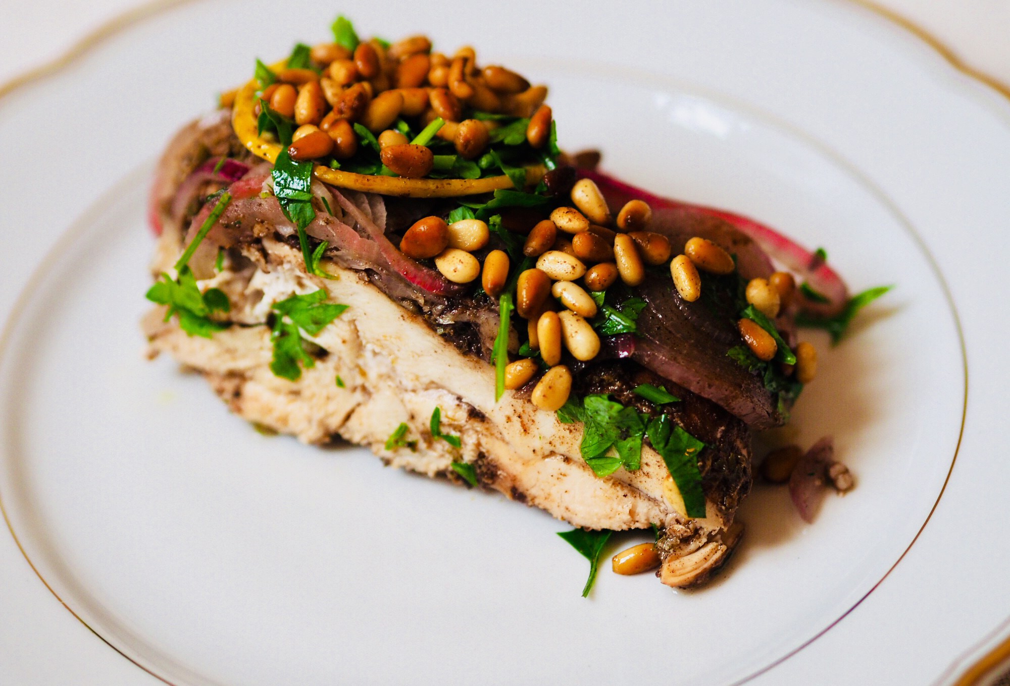 6. Bräter aus dem Backrohr nehmen und die Pinienkerne in Butter sowie die Petersilie über die Hühnerbrustteile verteilen.